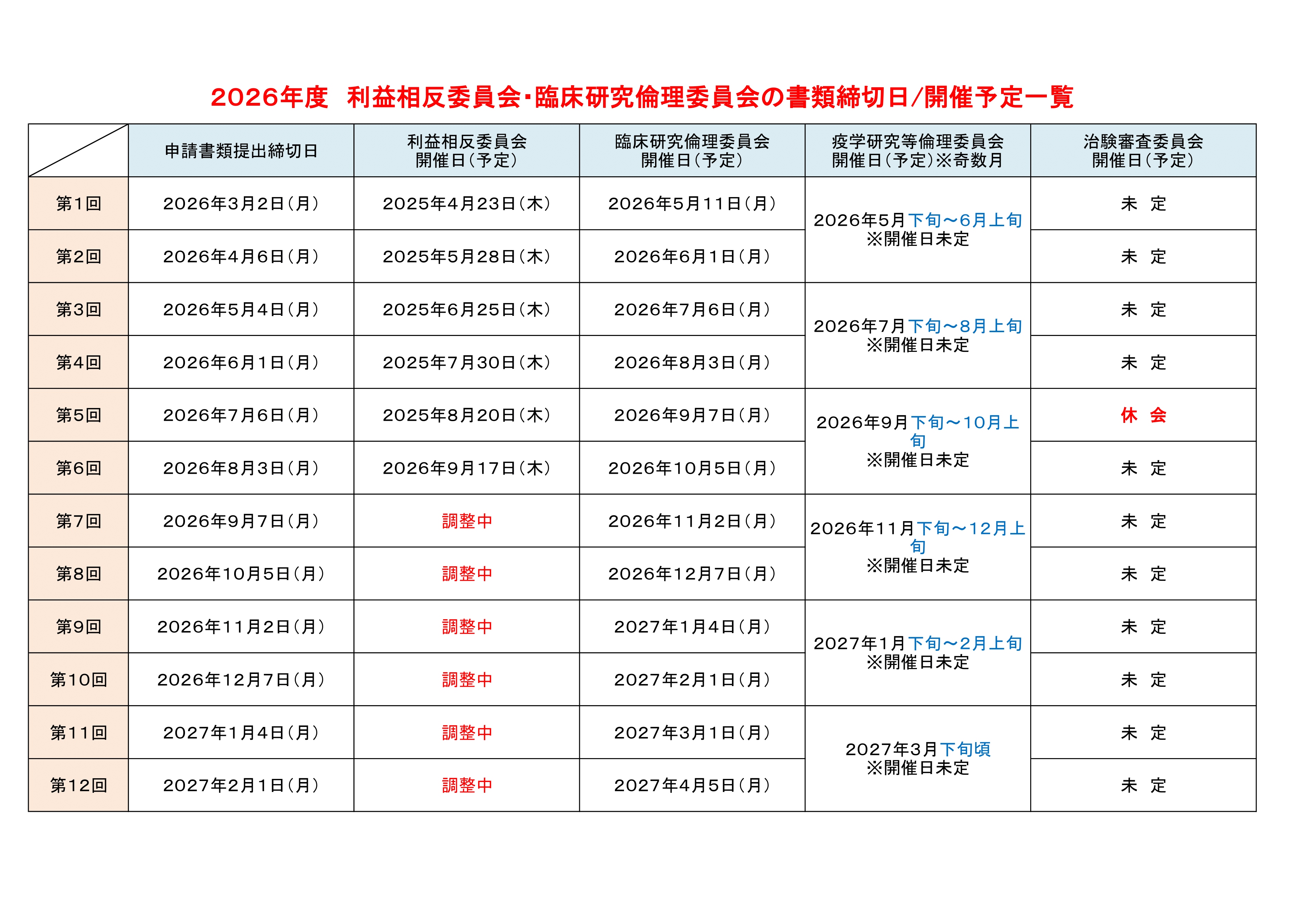 2025年度 利益相反委員会・臨床研究倫理委員会の書類締切日/開催予定