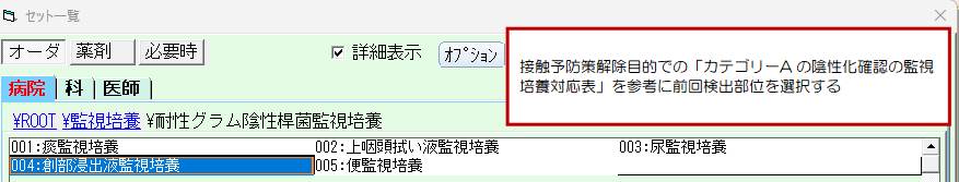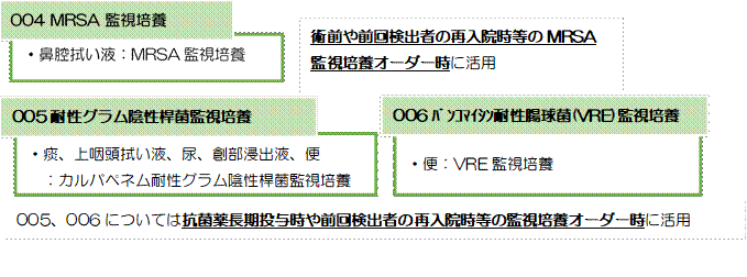 費用は病院負担として保険請求しないため、患者への費用の請求は生じない。また、監視培養検査を行う場合は、患者に別紙の説明書「監視培養検査に関する説明とお願い」を用いてあらかじめ説明を行う(Thinkの文書作成システムによりカルテ記載・印刷が可能である)。説明者は、医師でも看護師でもかまわない。 この項目は一部の耐性菌に限った検査であり、その他の菌は検出対象とならない。その他の菌も含めて感染症の原因菌検索を希望する場合は、通常の培養同定検査で保険診療としてオーダーする。 |