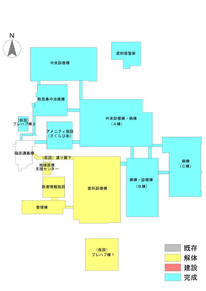 近年では、コンビニエンスストアやレストランが入店しているさくらぴあ(アメニティ棟)が令和6年4月より、A棟(新外来診療棟・病棟)が令和6年9月より稼働を始めました。