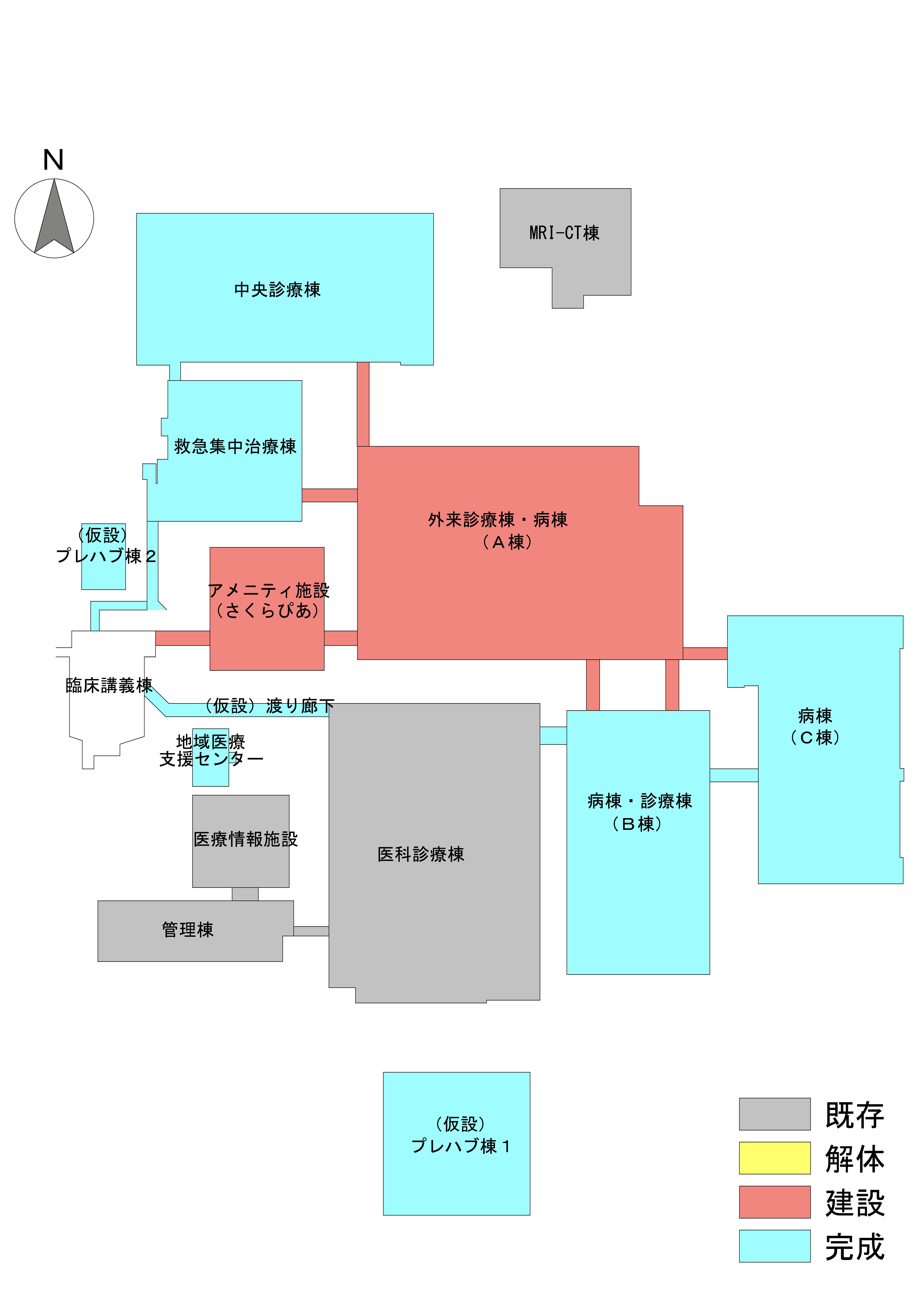 近年では、コンビニエンスストアやレストランが入店しているさくらぴあ(アメニティ棟)が令和6年4月より、A棟(新外来診療棟・病棟)が令和6年9月より稼働を始めました。