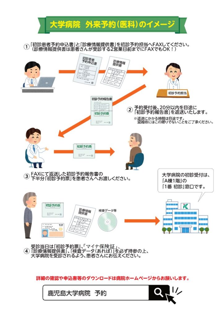 | 初診紹介患者予約専用FAX | 099-275-6698(平日 9:00~17:00 受付) ※FAX受信は24時間可能。17時以降は翌診療日以降対応。 |