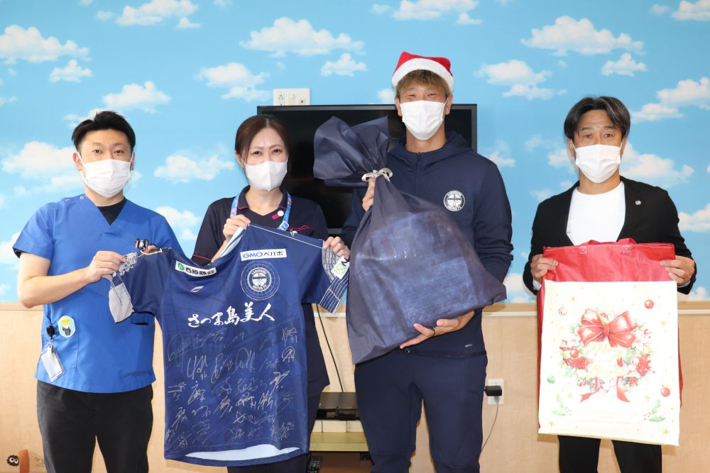 また、棈松病棟医長へ鹿児島ユナイテッドFCに所属する選手全員のサインの入ったユニフォームが寄贈され、患者さんからはお礼のクリスマスカードが藤嶋選手に贈られました。