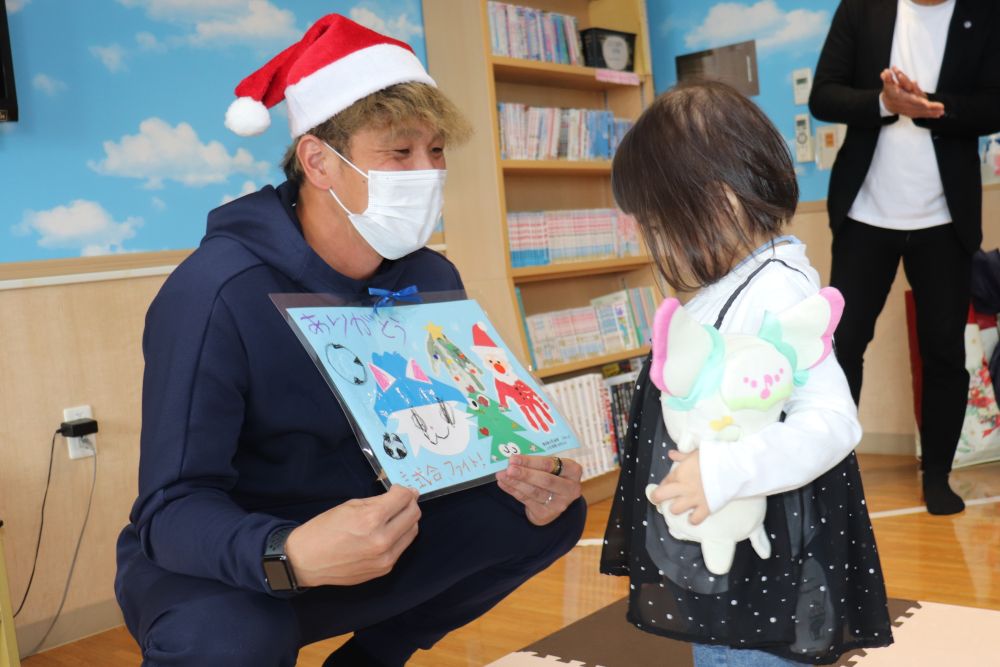 当日は、クラブ代表 湯脇 健一郎様と藤嶋 栄介選手より、プレイルームに集まった小児科の患者さん一人一人に、クリアファイルやアクリルスタンド、ウエアなどが入ったクリスマスプレゼントが贈られました。