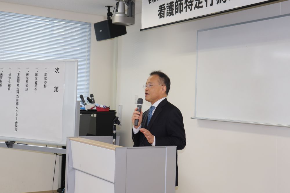 入講式では、石塚 賢治病院長、看護師特定行為研修センター 新山 修平センター長、鹿児島県看護協会 八田 冷子会長が、祝意を表するとともに、研修生へ激励の言葉を贈りました。最後に、研修生一人一人より本研修に対する抱負が述べられました。